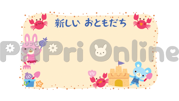 砂浜の動物たちと「新しいおともだち」の飾り枠