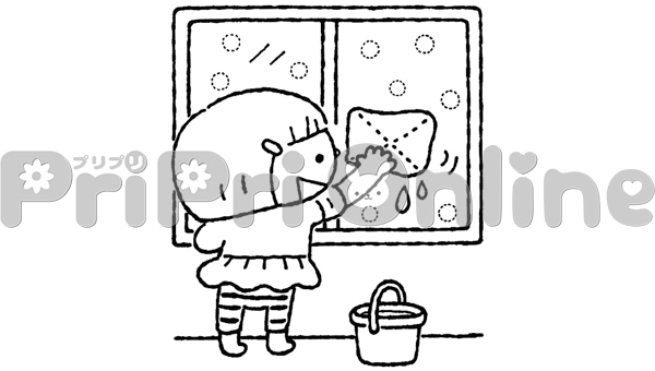 大掃除で窓を拭く女の子のイラスト(白黒)