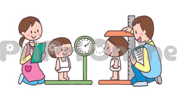 身体測定をする子どもと保育者のイラスト