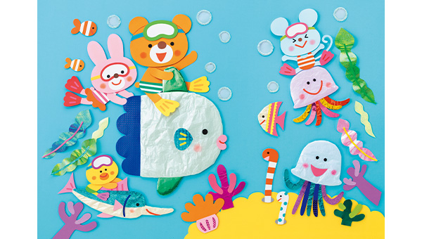 海のいきものや海藻に、光沢のある紙を使って。 キラキラした夏の海を表現します。