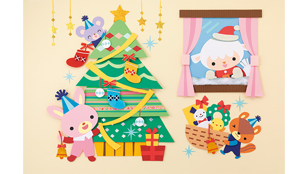 ツリーは三角の下部を少し浮かせて立体感を出し、マスキングテープやフェルトのくつ下などで飾ります