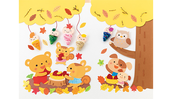 みのむしの体は、円すい形のフェルトに毛糸を巻いて。 動物たちに落ち着いた色を使うと、カラフルなみのむしが引き立ちます。