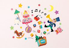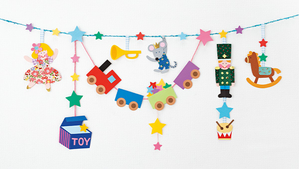 クリスマスの雰囲気いっぱいの12月の保育室には、子どもたちの大好きなおもちゃをモチーフにしたガーランドを。