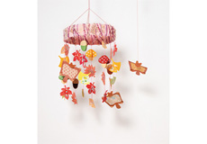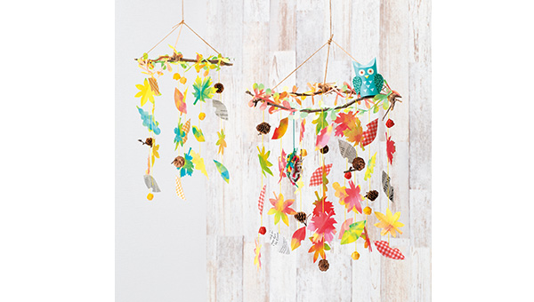 染めた障子紙や柄折り紙を、それぞれ葉の形に切って吊るします。 水色のふくろうがアクセントに。