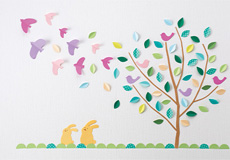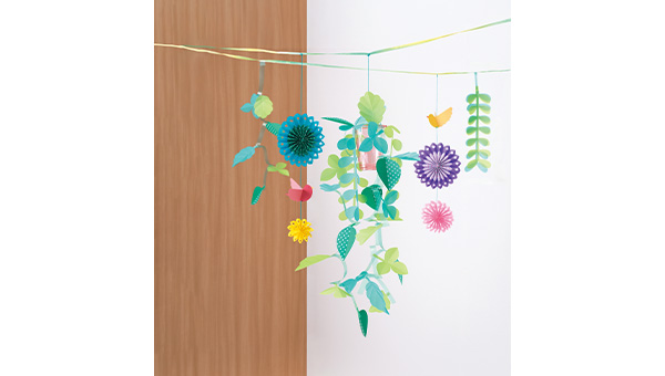 初夏の風でゆらゆら、くるくる。透明感のある素材を組み合わせた葉っぱと、 ペーパーファンの軽やかな飾りです。