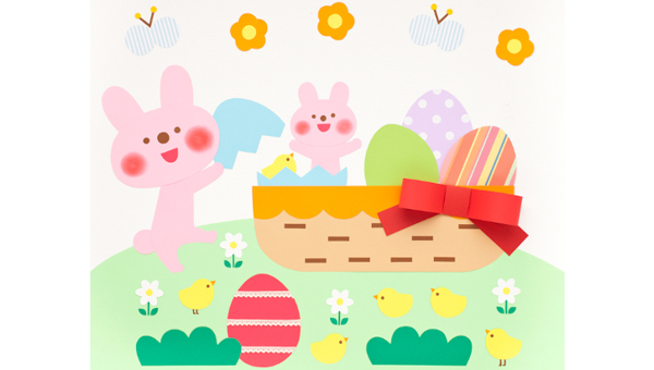 たまごの中には、元気なうさぎちゃんとひよこちゃんがかくれんぼ! かごに立体的なリボンをあしらうと、メリハリが出ますよ。