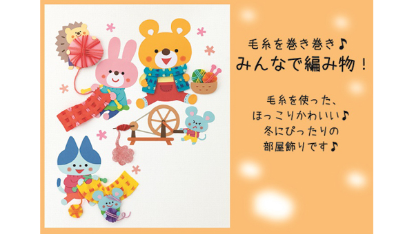 長~い毛糸はどうやってできるのかな? 糸をつむぐ道具や編みものについて、子どもたちと話すきっかけに。 編み物は、フェルトに穴を開け、毛糸を通して表現します。