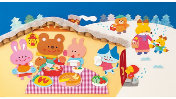 温かいおうちの中で動物たちが料理を作り、お友だちの帰りを待っています。