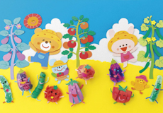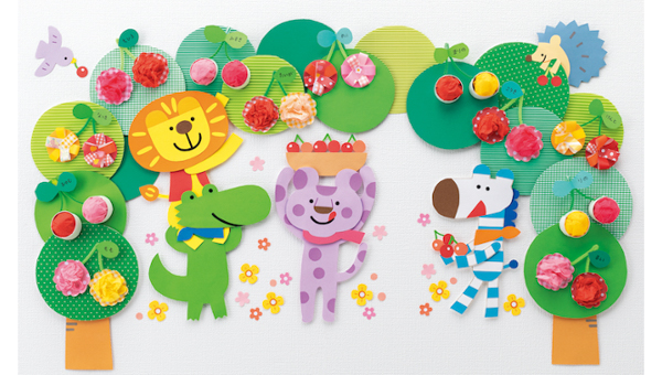 木の茂みは、素材を変えて重ね、奥行きを出します。緑のシンプルなシルエットで、子ども製作のさくらんぼを印象的に。 さくらんぼの作り方も、3プランご紹介しています。