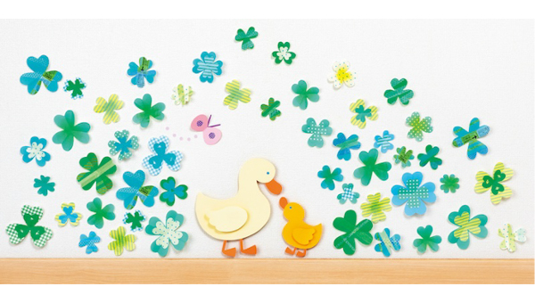 あひるの親子と沢山のクローバーがとってもキュートな、春の訪れを感じられる壁面飾りです。 四葉のクローバーをしのばせて、みんなで探したら盛り上がること間違いなし♪