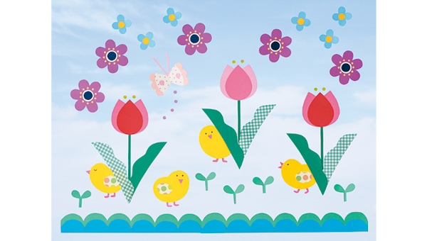 春の花壇でひよこたちがかくれんぼ! 入園児のお部屋にぴったりな窓飾りです。
