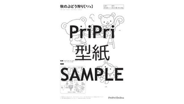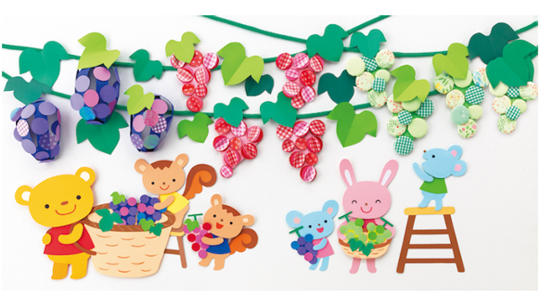 ぶどうの収穫を楽しむ動物たち! 素材や形が違う3種類のぶどうを、綿ロープからぶら下がるように飾ります。