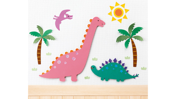 子どもたちが大好きな恐竜をカラフルに表現! 恐竜の体にはオーロラ折り紙をプラスして、太陽の日ざしを受けてキラキラしている様子に。