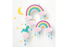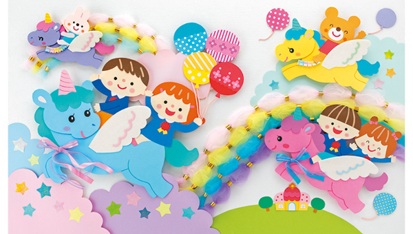 カラフルなユニコーンと虹は、保育室はもちろん、卒園・入園時期のホールなどにもぴったり! 虹をチュールで作れば、角度や位置を調整しやすいのがポイントです。