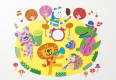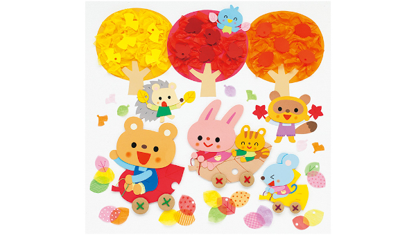 落ち葉の車で競争だ! 赤・黄・オレンジに紅葉した葉っぱが、壁面を明るく彩ります。