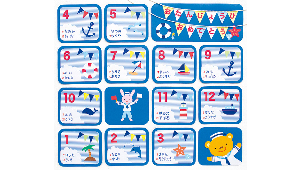ボーダー柄のお誕生月に、海のモチーフを入れたお誕生表。 マリンカラーで統一して、さわやかな雰囲気にしあげましょう♪