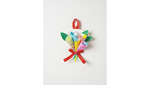 半円に切った折り紙や柄折り紙を、橋から丸めてテープで止めます。形が崩れてもOK!何個かまとめると花束らしくなります。