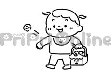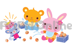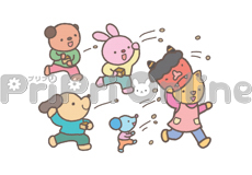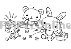 節分の豆まきと動物の子どもと保育者のイラスト(白黒)